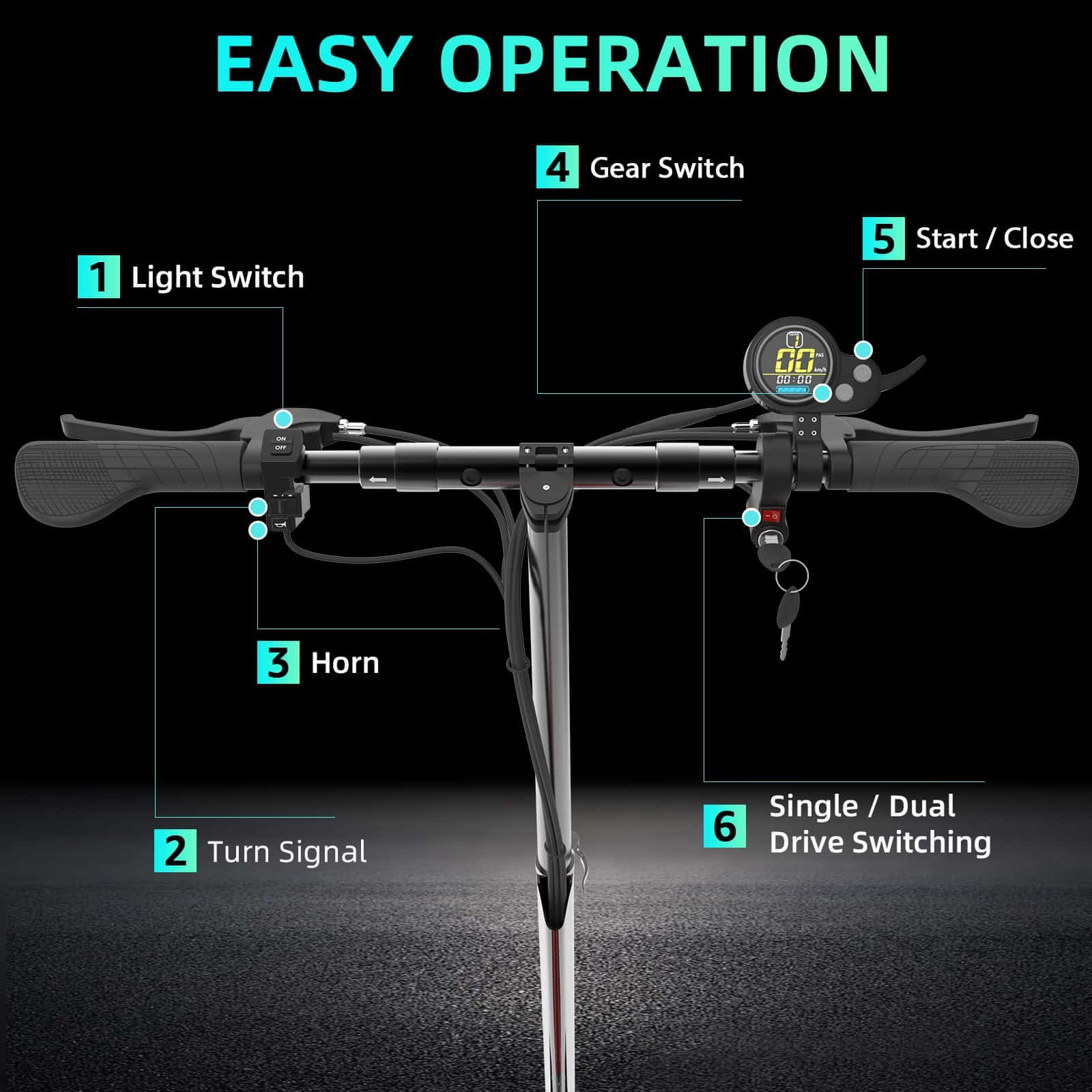 - 【Easy Operation】: After unlocking the electric scooter with the remote control, press and hold the accelerator and push the scooter forward to start. Select the speed mode according to different road conditions. Control the speed simply through the throttle and brake. Cruise mode allows you to not always press the throttle. The electronic disc brake can quickly stop the scooter. The strength of the brake can be adjusted by the display.